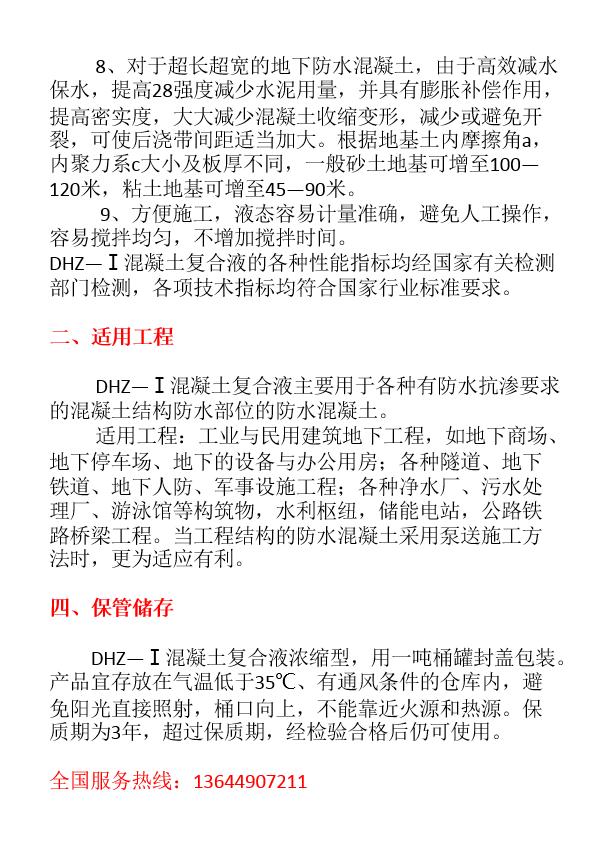 DHZ-I混凝土復合液(納米結晶自密實劑),是目前國內(nèi)僅有的一種多功能高性能混凝土結構自防水材料。采用DHZ-I混凝土復合液(納米結晶自密實劑)更切合住建部新出臺的地下室防水不低于結構設計工作年限50年的要求,同時大幅度節(jié)省地下工程防水投資成本50%左右,節(jié)省施工工期30%以上,也免除地下工程后期滲漏水維修成本,用戶可高枕無憂。產(chǎn)品為無毒液體,不污染環(huán)境,對人體無害,屬于綠色建材建筑產(chǎn)品,產(chǎn)品獲得國家發(fā)明專利,多次榮獲國內(nèi)外發(fā)明大獎。