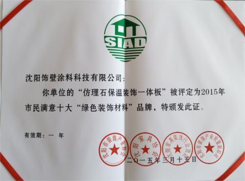 沈陽飾璧涂料科技有限公司在遼沈家具裝飾行業(yè)參選的500多家企業(yè)中脫穎而出,得到了行業(yè)和消費者的一致認可,獲得了“10大綠色裝飾材料品牌”的殊榮。