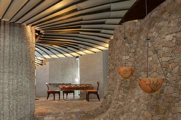 室內(nèi)設(shè)計(jì)師 John Vugrin 被這對(duì)夫婦委托深化室內(nèi),依然是信任和放手去干吧。John Vugrin 感動(dòng)到哭,在這個(gè)建筑里花費(fèi)了數(shù)年苦心工作。盡力將一張桌子一英寸鋪地都做到完美。內(nèi)部風(fēng)格近似純手工全定制的高迪風(fēng)格。在地面的鋪陳中,設(shè)計(jì)師頗用心,每個(gè)區(qū)域都使用不一樣規(guī)格相近色調(diào)的地磚,以不同的樣式拼貼,逐步上升到墻壁。屋頂?shù)牟A齑爸饾u下降到地面。兩者之間有海螺花紋的吊頂,將內(nèi)部空間與粗糙混凝土表面融為一體。最終交付時(shí),每一盞燈都是定制設(shè)計(jì)的。