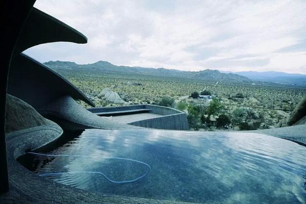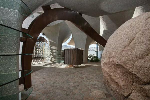 幾年后到了1993年,這座局部有二層的別墅的結(jié)構(gòu)主體竣工了。建筑的外觀看起來和沙漠的巖石顏色相近,形態(tài)卻具有想象力,尤其是從室內(nèi)看出去,混凝土結(jié)構(gòu)之間的異形玻璃跳窗,讓使用者有身處太空飛船降臨地球的感覺。建筑從高處看,有著長而低的流線和向上傾斜的平面。
