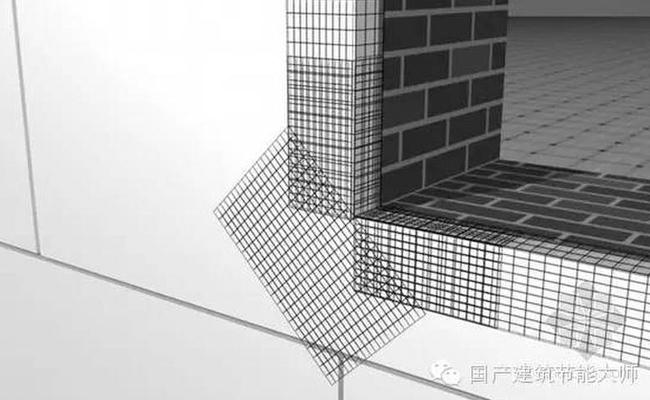 7,當(dāng)遇到門窗洞口時(shí),在洞口四角處沿45º方向做加強(qiáng)網(wǎng),尺寸400×200mm;在四角內(nèi)側(cè)陰角加鋪與保溫等寬標(biāo)準(zhǔn)網(wǎng),長度每邊100mm,防止