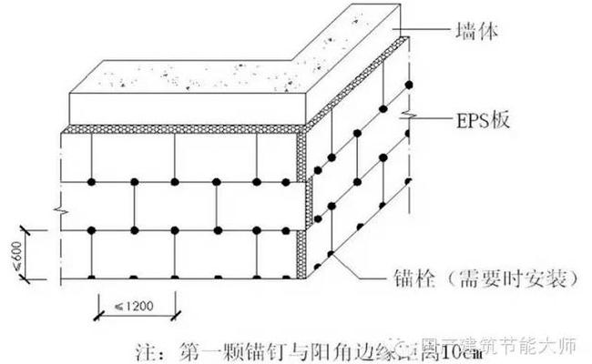 以涂料為外飾面時(shí),錨栓可安裝在EPS板上。錨栓安裝應(yīng)在膠粘劑干燥24h后進(jìn)行。在抹面砂漿在未硬化的狀態(tài)時(shí)安裝錨栓,會(huì)比較方便,玻纖網(wǎng)格布也不會(huì)發(fā)生起皺、拉扯等現(xiàn)象。如過晚打入錨栓引起錨盤周圍防護(hù)面層有細(xì)微裂紋,如有細(xì)微裂紋應(yīng)立即涂抹抹面砂漿修補(bǔ),并酌情埋入網(wǎng)格布。