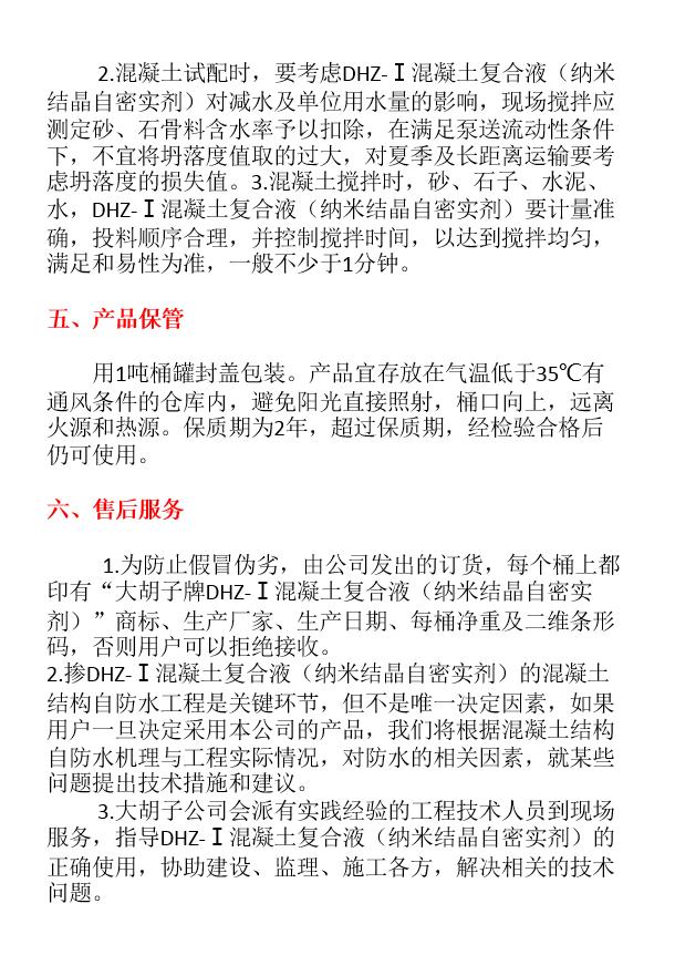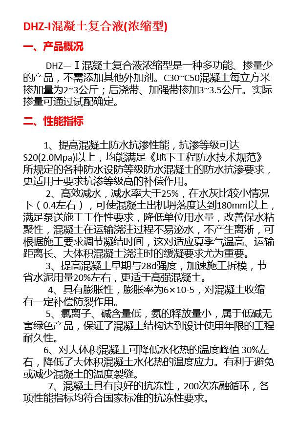 DHZ-I混凝土復(fù)合液(納米結(jié)晶自密實(shí)劑)(濃縮型)混凝土每立方米摻量為2~3公斤,后澆帶、加強(qiáng)帶摻量為3~4公斤,實(shí)際摻量可通過試配確定。