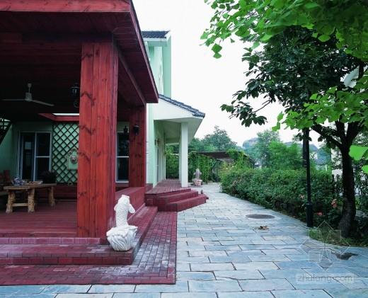 圖2 立柱上的棗紅木紋漆加上同樣顏色的仿磚涂料,墻體的白色憎水乳膠漆,周圍的綠蔭環繞。打造出經典的美式田園風,生活在愜意的優美環境中,讓人們的心情也更加愉悅。