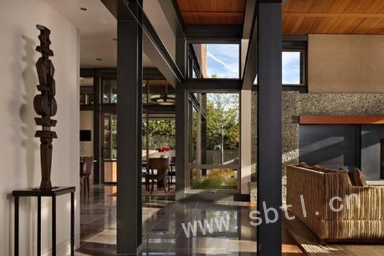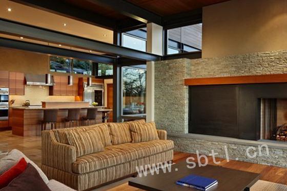 位于西雅圖的McClellan Architects設計了這棟位于湖畔的時髦住宅。其特點是擁有一部電梯、一個綠色屋頂、LED照明以及迷人的海濱景色。房屋坐落在一個陡峭的濱水地段。一部使用斯卡普島風格裝飾的黑色鋼結構樓梯、威尼斯石膏裝飾墻(文化石涂料)、明亮的LED燈具,看起來就像一片金色的樹葉。電梯位于房屋后部,可以直達父母的臥室和客廳,站在綠色的屋頂上便可以欣賞到湖畔的美景。